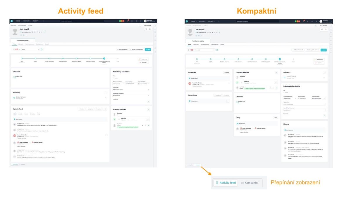 Toto zobrazení se hodí uživatelům, které nezajímá celkový pohled na kandidáta, ale zajímá je například jen jeden typ akce – např. pro hiring manažera, který chce pouze číst a zapisovat poznámky.