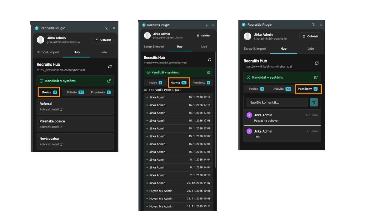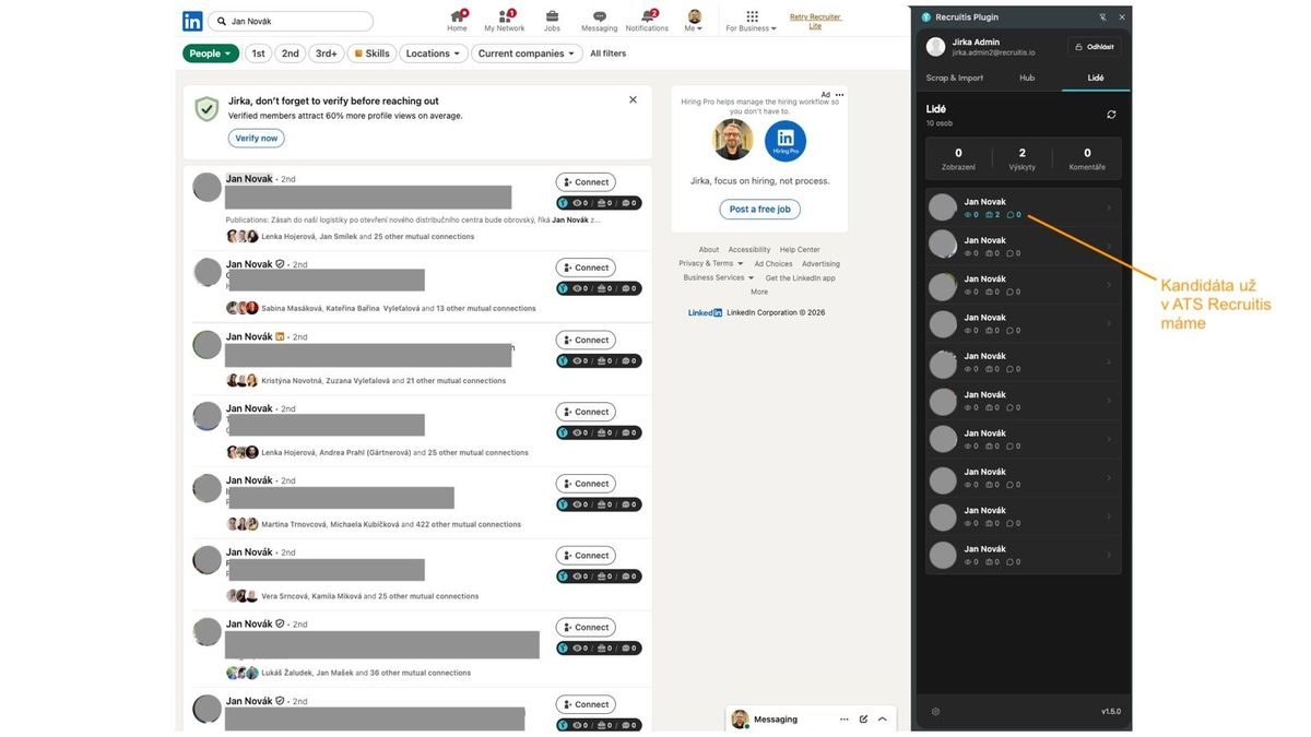 Pokud na síti LinkedIn hledáte, můžete si na stránce s výsledkem vyhledávání zobrazit záložku "Lidé" a tam se vám ukážou základní informace z hubu - tedy, jestli už dané profily máte uložené v ATS Recruitis a pokud ano, kliknutím na daného člověka se přepnete na jeho záložku Hub.