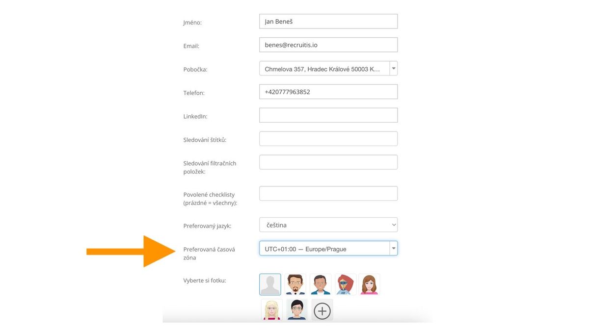 V rámci nastavení profilu uživatele si mohou uživatelé, nastavit libovolnou časovou zónu pro kalendář v rámci ATS Recruitis. Toto nastavení mohou měnit také administrátoři za jednotlivé uživatele, podobně jako např. jazykové nastavení.