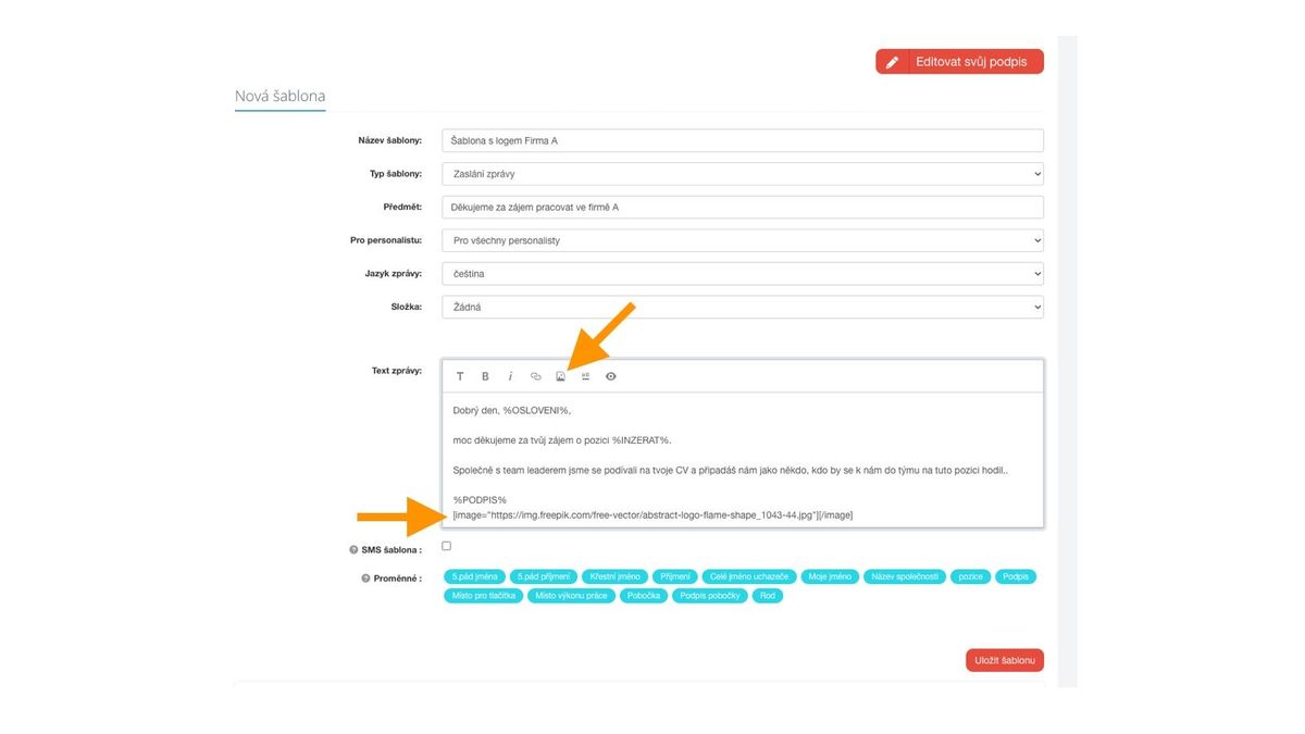 Za podpis vložíte odkaz na požadované logo stisknutím tlačítka s ikonou obrázku, který je umístěn v horní části textového editoru. Hotovou šablonu už jen stačí uložit stisknutím tlačítka "Uložit šablonu".
