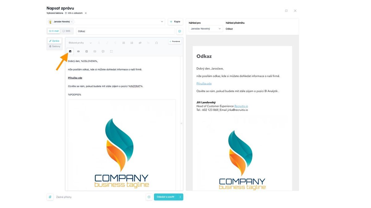 <table><tr><td><img src="https://firma.cz/images/logo_firma_A.png" alt="img" width="260" height="270"></td><td><b>Jiří Recruitér</b><p> </p><div>HR Manager</div><p><br></p><div>+420 602 123 868</div><br><div>jirka@recruitis.io</div><br><div>www.recruitis.io</div><br><div>SChmelova 357, 500 03 Hradec Králové</div></td></tr></table>Pokud emailové logo chcetě změnit jen na ad-hoc bázi, můžete tak učinit v dialogu při odesílání zprávy. Zde platí postup jako u přídání loga do emailové šablony - musíte stisknout tlačítko s ikonou obrázku a poté vložit URL obrázku.