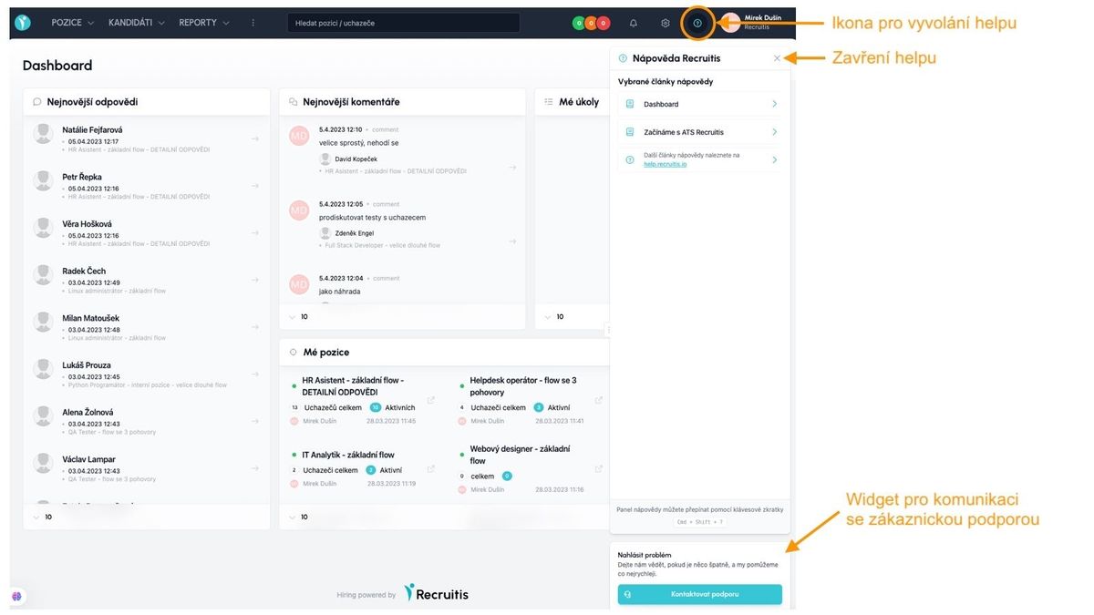 Ikona podpory "?" v rámci ATS Recruitis obsahuje kromě jiného také widget, kterým můžete nahlásit požadavek na podporu ATS Recruitis, ať už jde o chybu nebo jen dotaz.