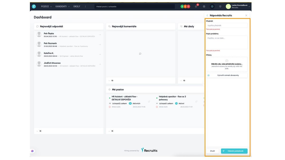 Výhodou využití widgetu ale je, že nemusíte ATS Recruitis opouštět - widget zaznamená všechny podstatné detaily včetně URL stránky, vaše jméno, detaily vašeho prohlížeče a můžete také přímo pořídit screenshot.