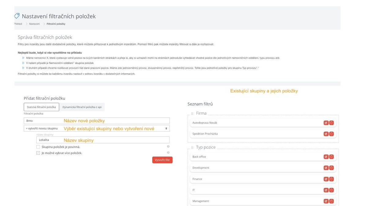 Definujte si vlastní kategorie a položky a to vám v přehledu pozic následně umožní dostat se rychle k relevantním položkám. Konkrétní filtrační položku přidávejte ke každé pozici v editoru pozic.