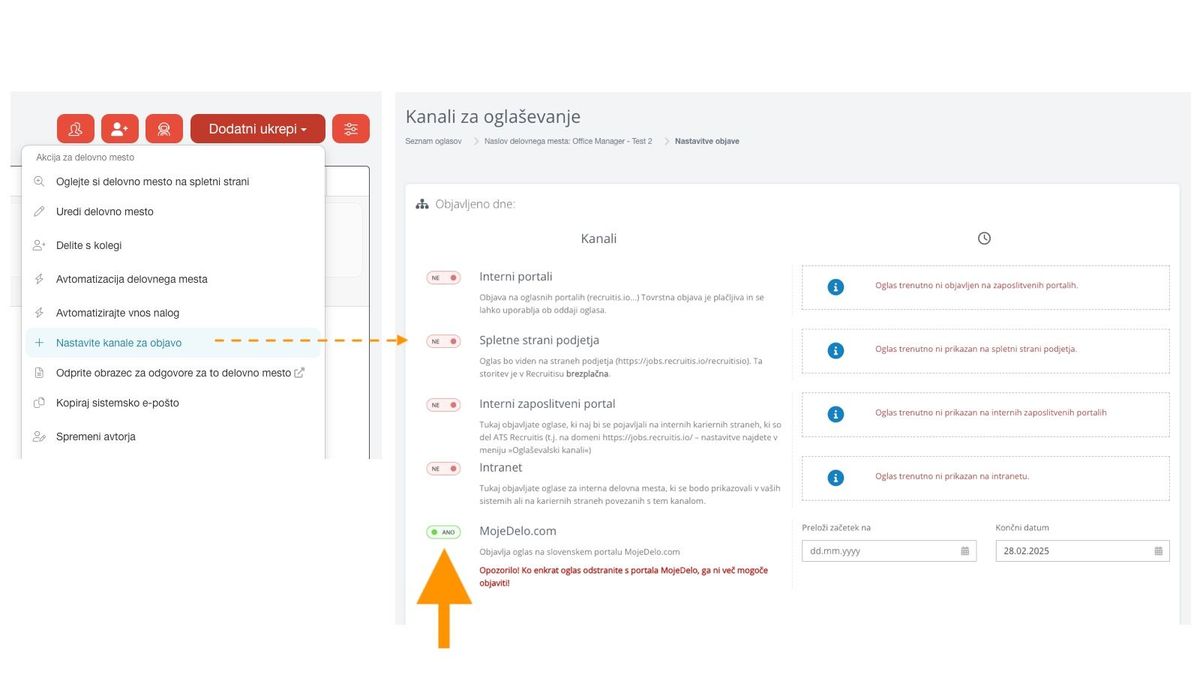 Delovno mesto lahko dodate v kanal objave MojeDelo šele po njegovi objavi. Ta kanal je na voljo samo v nastavitvah kanalov objave, ne pri začetni objavi delovnega mesta.